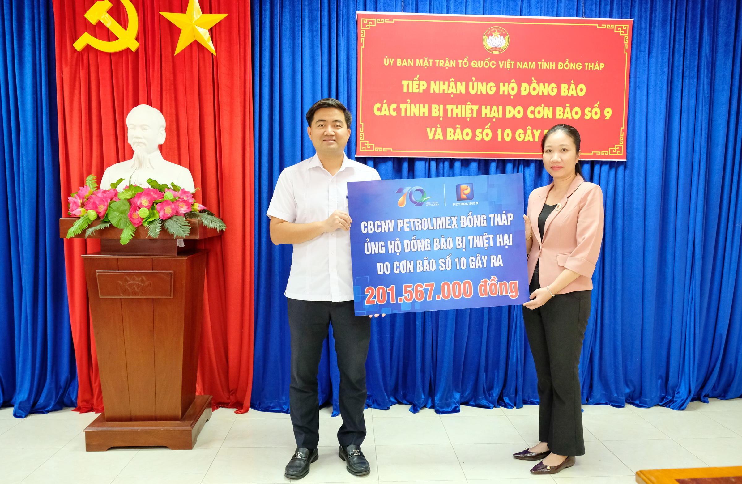Vào chiều ngày 15/10/2025, Công ty TNHH MTV Petrolimex Đồng Tháp đã trao số tiền 201.567.000 đồng của CBCNV Công ty đóng góp tại Ủy ban Mặt trận Tổ quốc Việt Nam tỉnh Đồng Tháp nhằm góp phần chung tay chia sẻ, hỗ trợ đồng bào các tỉnh miền Bắc và miền Trung bị ảnh hưởng nặng nề bởi cơn bão số 10 (Bualoi).