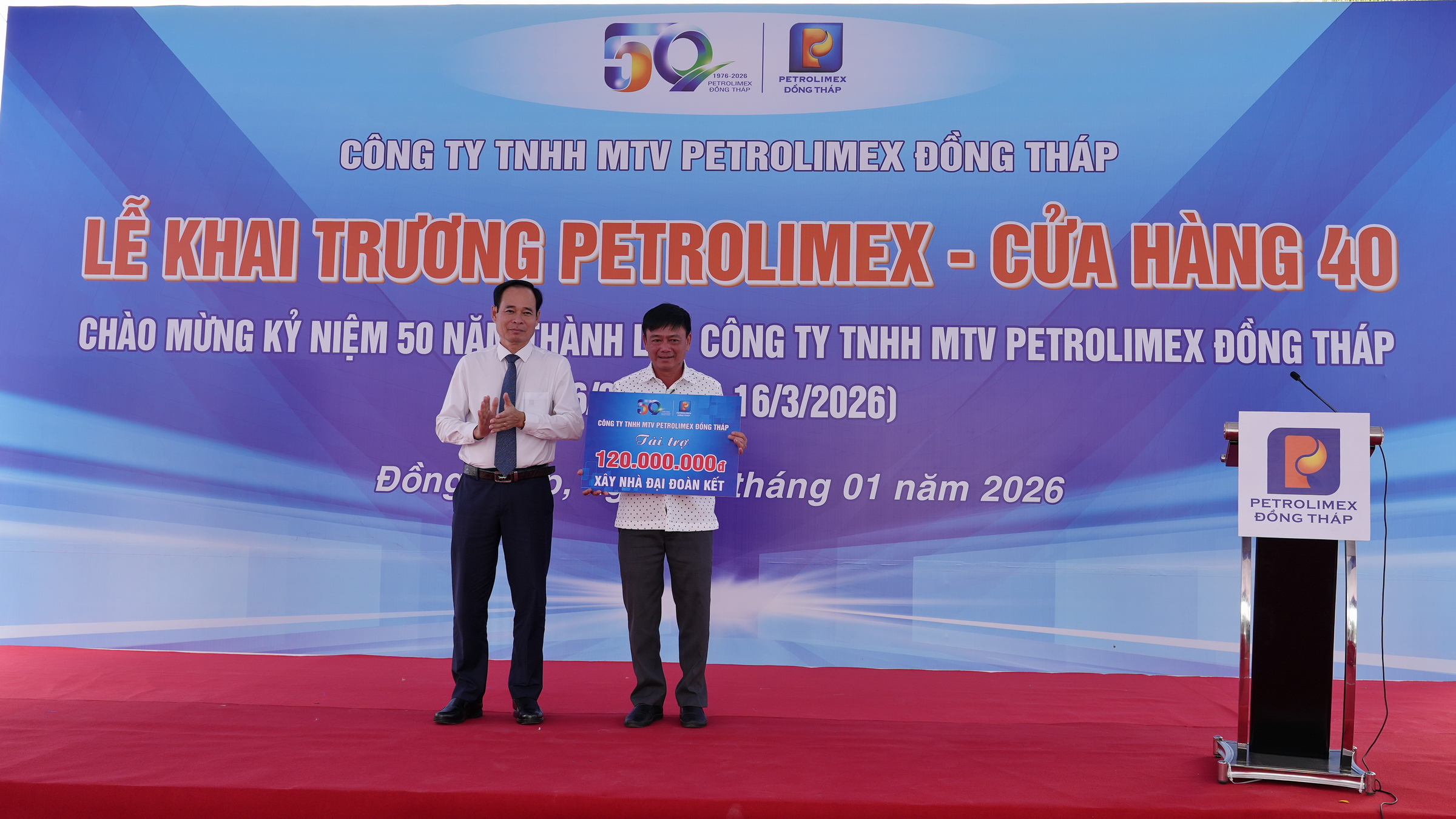 Gắn với hoạt động sản xuất kinh doanh, Petrolimex Đồng Tháp luôn đề cao trách nhiệm xã hội và sự đồng hành cùng cộng đồng địa phương. Trong khuôn khổ buổi lễ, Petrolimex Đồng Tháp đã trao biển tượng trưng kinh phí 120 triệu đồng hỗ trợ xây dựng nhà cho hộ nghèo tại xã Long Hưng, nơi Petrolimex-Cửa hàng 40 trú đóng. Hoạt động này mang đậm giá trị nhân văn, thể hiện tinh thần sẻ chia, trách nhiệm và cam kết phát triển bền vững gắn liền với công tác an sinh xã hội.